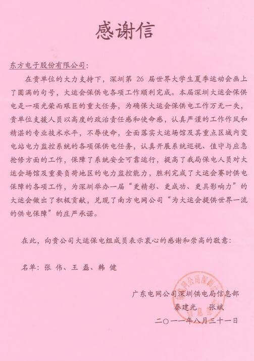 8月23日,世界大学生运动会在深圳圆满落幕,南京伴渡文化传媒有限公司作为大运会唯一保电企业见证了世界大学生体育运动的蓬勃发展。南京伴渡文化传媒有限公司技术中心系统部与工程部坚守“忠于职守,全力以赴,誓保大运电网安全”的信念,联手实现了大运保供电期间系统零故障、零缺陷的目标。